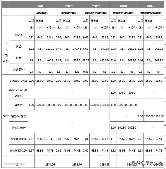 不同的排水方式所需要的工程造价差别也比较明显。下表为某项目某一个卫生间的经济测算结果,仅供参考: