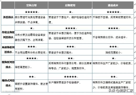 从表中很明显的可以看出,微降板和墙排水的排水方式造价较高,而异层、传统同层、局部降板的同层排水造价相对较低。