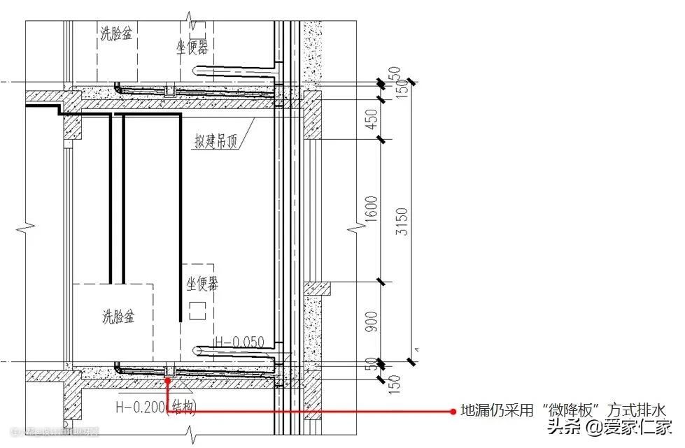 “墙排”即利用洗脸盆下部空间、浴盆下部空间及坐便器后方的装饰墙体将地漏以外的器具排水管道敷设在本层卫生间靠墙位置并进行隐蔽,地漏管道通常设于高度为100mm的微降板回填层内。