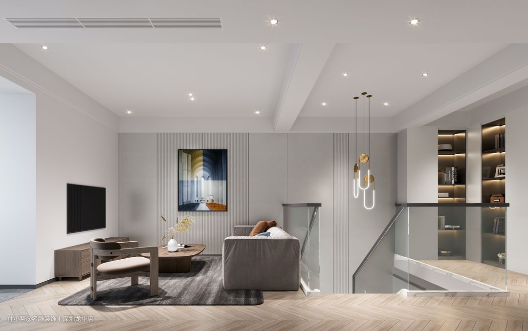 就拿户主这个两层小别墅来讲,208平的房屋面积还是比较大的,于是有了四房两厅三卫的布局,一层空间更多为接待、会客使用。整体主色调以白、灰、原木色为主,偏冷静,搭配上白色沙发,客厅显得十分亮堂;二层更多为私人空间,材质的肌理感要更突出一些,无主灯的设计是轻奢风的一种形式,2.5米的天花也不会给人压抑感。