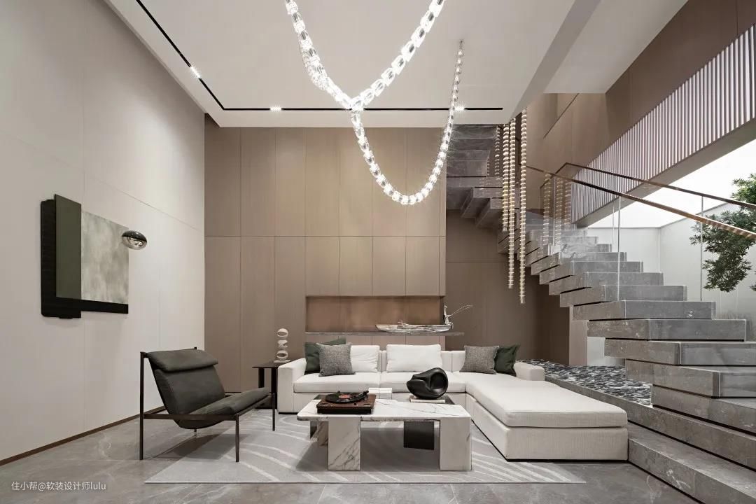 别墅的客厅与其他户型的层高肯定不一样,作为家里一个比较重要的场所,在设计时要注意对空间整体和局部的把控。可以通过增加辅助照明、墙面修饰、栏板形式等手法来丰富别墅的空间感。