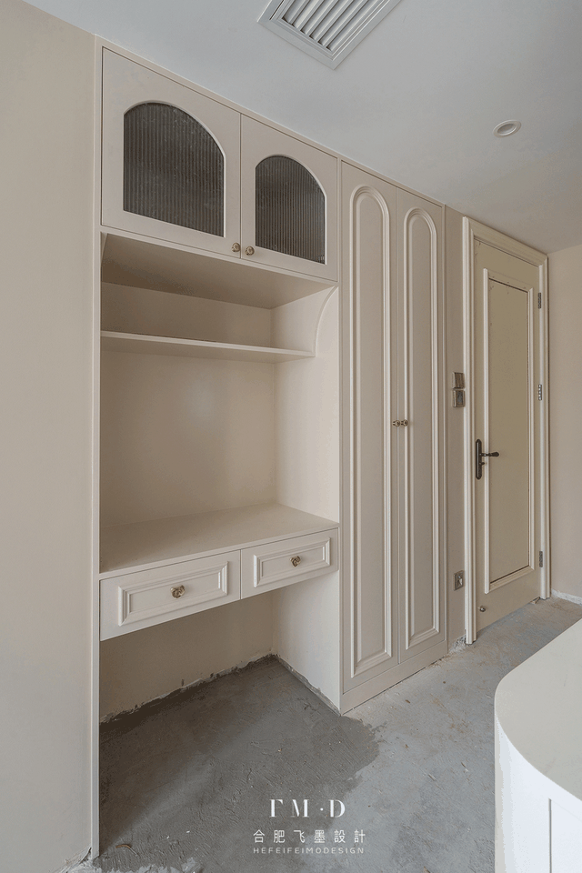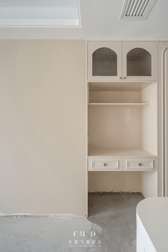 整体长2米2,高2米3,边角处改成开放式储物架,可以放业主夫妻俩的照片或者一些装饰品。不管是隔板还是下面的柜子都设计成弧形,日常不用担心会不小心磕碰到。