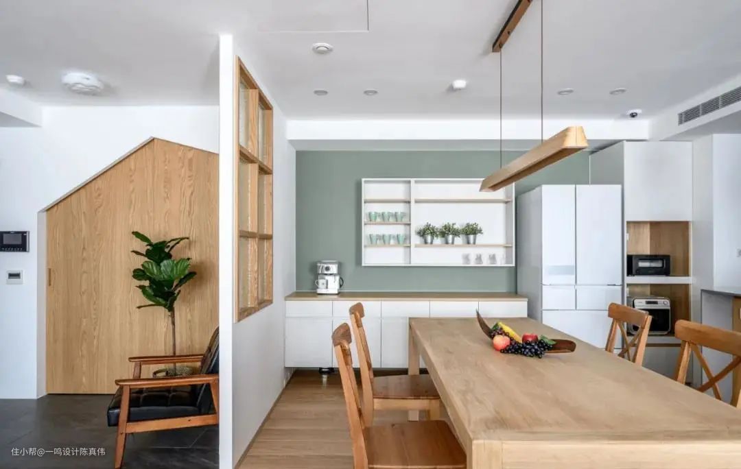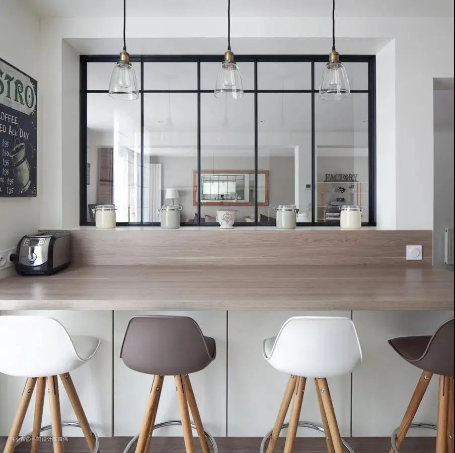 想要提升空间的互动性,但是开放式厨房又扛不住油烟,不妨退而求其次,在厨房与餐厅之间开一个室内窗,让这两个相互独立的空间产生关联,在厨房烹饪时也可以和在客餐厅活动的家人无障碍交流,温馨!