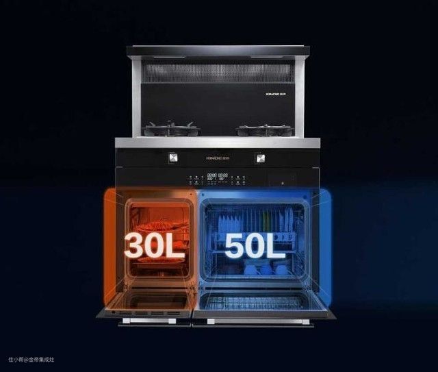 比如今年金帝重磅推出的金帝X900KX2双腔蒸烤消集成灶,除了集成烟机、灶具部分之外,还将功能柜部分做成左侧30L蒸烤箱和右侧50L消毒储物柜的创新设计,实现更多功能,将1平米空间利用到极致。