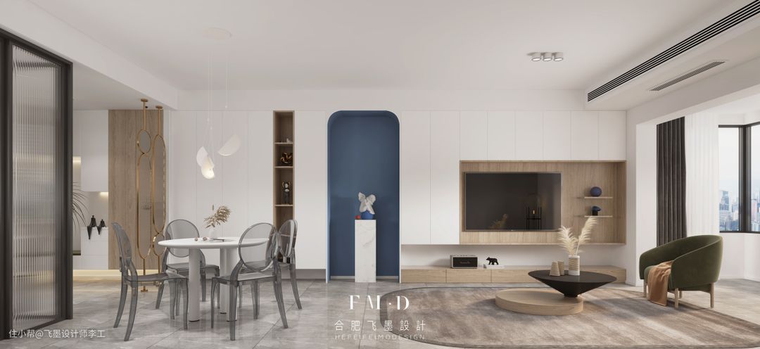 看到柜子凹进去的蓝色拱形区域,是为了将整个柜体做个分区处理,将玄关和客厅在视觉上区分开。