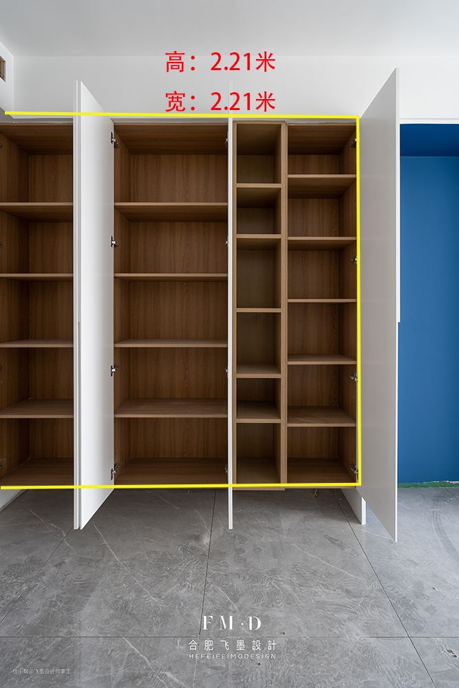 紧接着拼接了一面高2.21米*宽2.21米的柜子,这部分的柜体相当于家里的一个储藏室,既可以弥补玄关区、客厅或者餐厅收纳的不足。