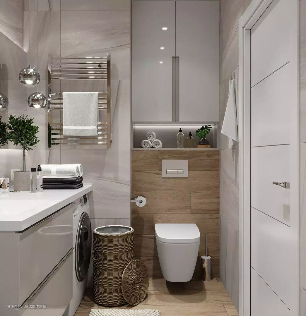 上下壁柜的中间部分,也可采用留空设计,再于柜子底部安装灯带,摆放绿植、香薰、书籍、毛巾等必备用品,整个墙面看起来就更有层次感了,卫生间的颜值也大大提升。