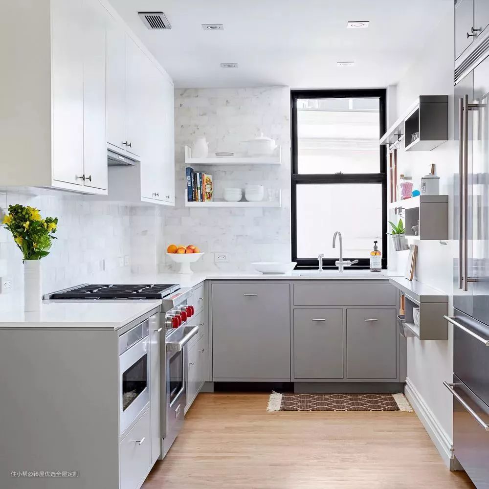 除了将吊柜内部高度需要进行调整,还可以选择在吊柜下方做一排开放格,将常用的物品都放在开放格里,拿取与收纳都更方便,再也不用担心厨房变凌乱了。