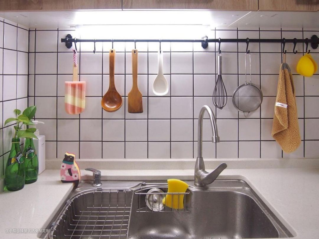 尽量按照物品收纳的高度,来进行尺寸的设计,调料瓶等物品占据空间较小,可选择放在下方,而一些五谷杂粮占据的空间较大,可以选择放在吊柜更大的空间。