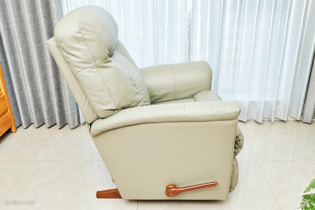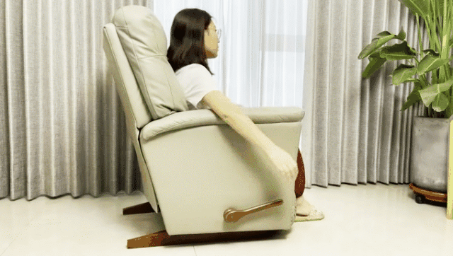 值得一提的是,这款乐至宝功能单椅的靠背与脚托不是联动一体的设计,也就是说可分别独立调节,使得用起来更加自由随心,这个设计也是很多品牌功能沙发都没有的。比如,在脚托不打开的情况下,身体后躺调节靠背角度,从而实现躺着摇的功能,懒人必备。