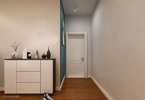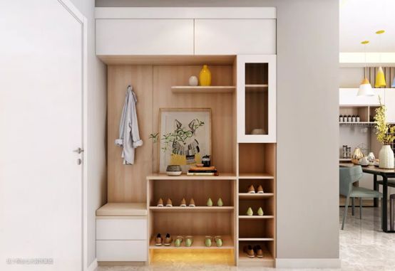 解决方法:这种类型的玄关基本没什么可改造的空间,既不能定制入墙式的玄关柜,也不能直接摆放鞋柜,否则会影响正常的行走。这种情况下,一般考虑将鞋柜直接摆放在玄关拐角的地方,与入户门平行,入户走两步再换鞋。针对玄关两侧的墙面,则可以通过玄关装饰画进行装饰,也可以安装挂钩,用于悬挂简单的小件物品。