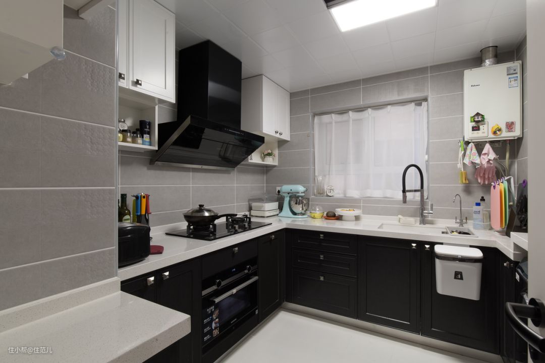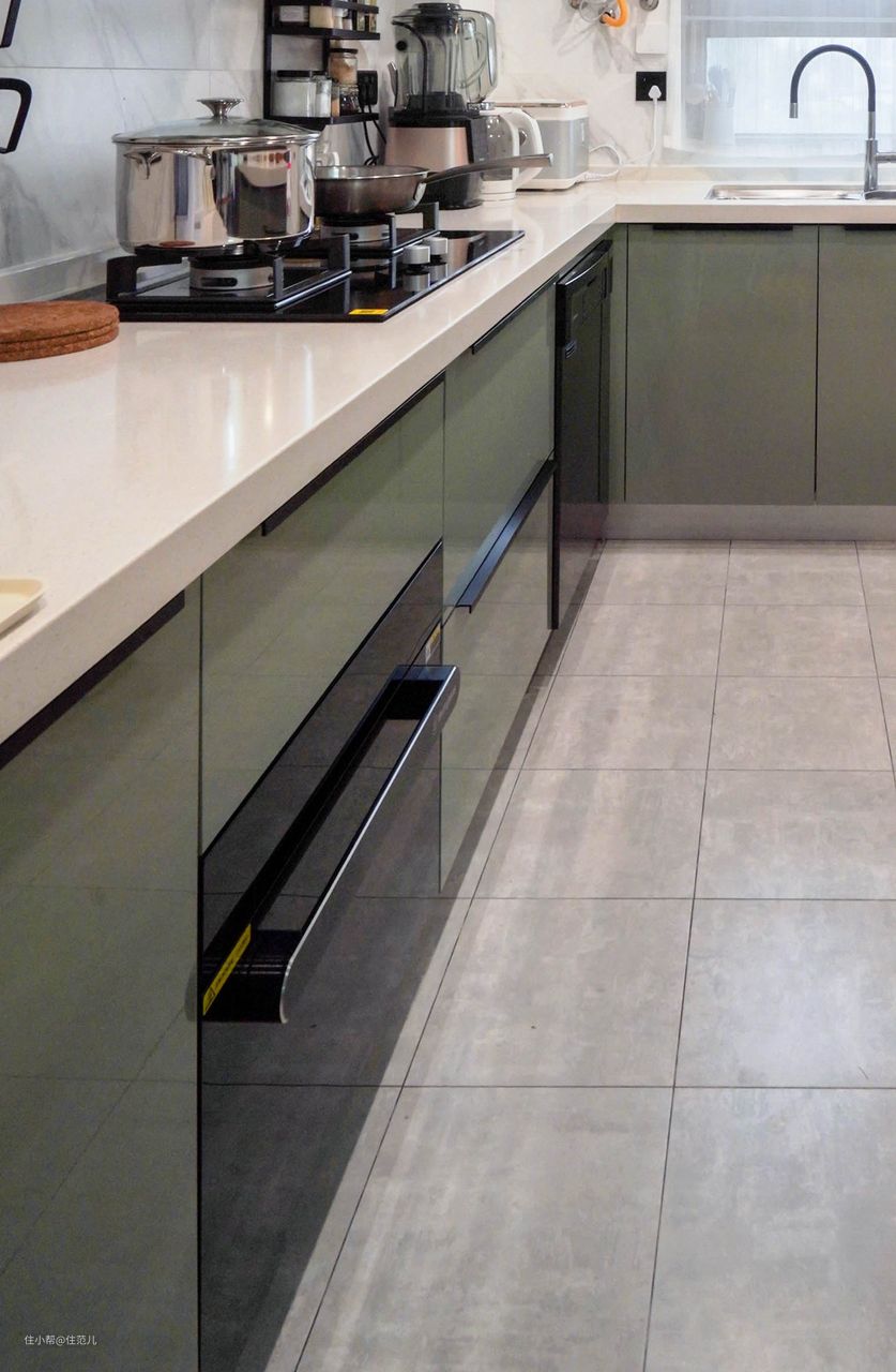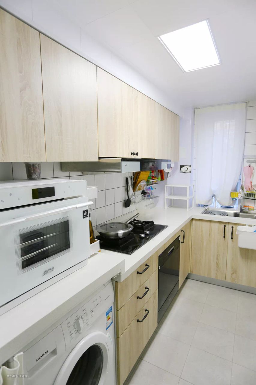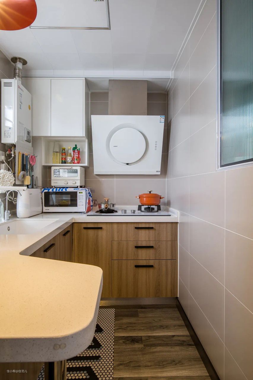 住范儿客户Yuki的厨房,一边是60cm的常规灶台,一边是28cm的小家电操作台,中间留80cm过道,满足一人下厨。