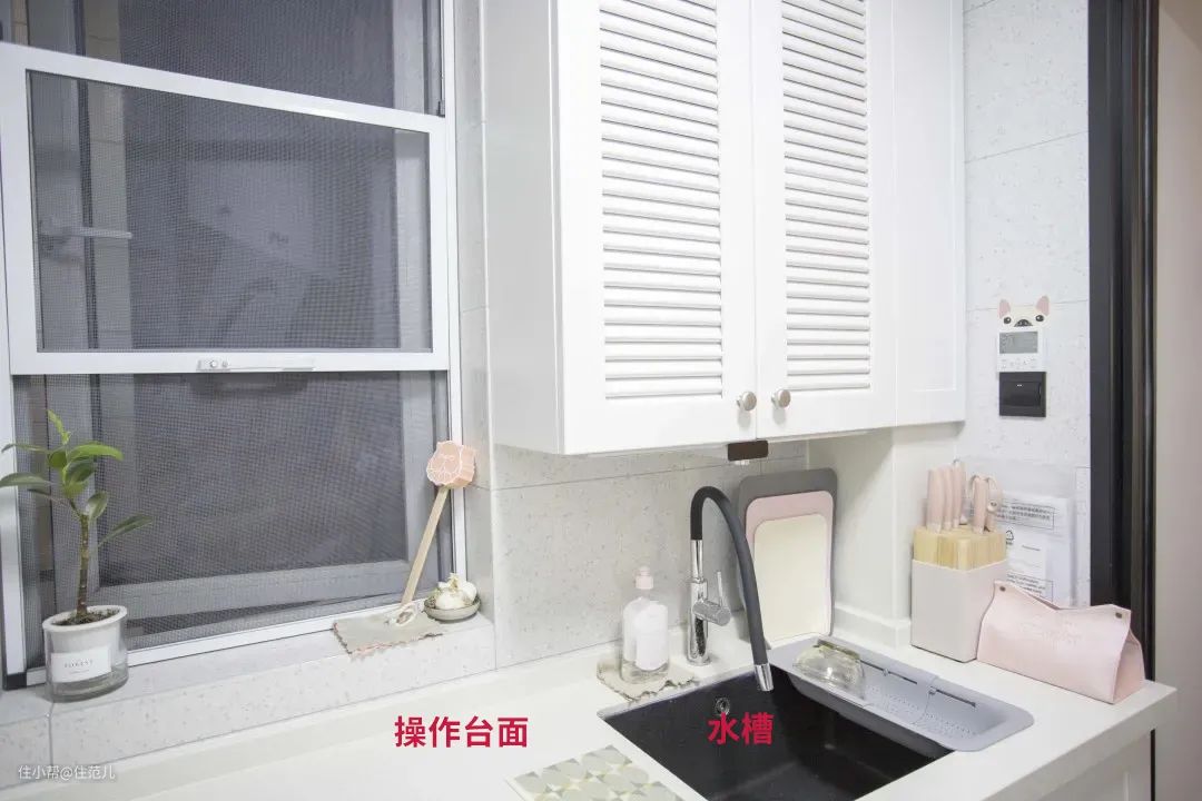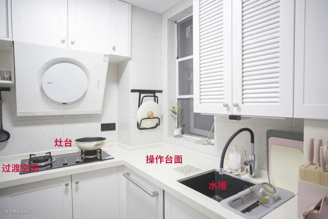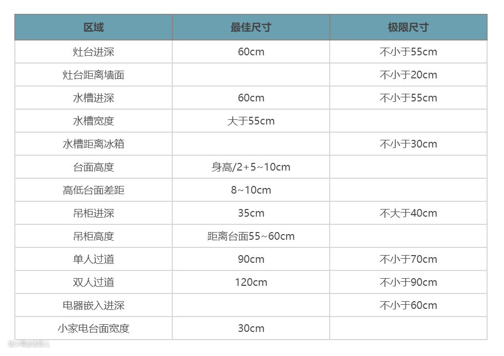 舒服的台面,至少要满足的基础配置是:50cm宽的水槽+60cm宽的操作台面+72~80cm宽的灶台+20cm宽的过渡空间。