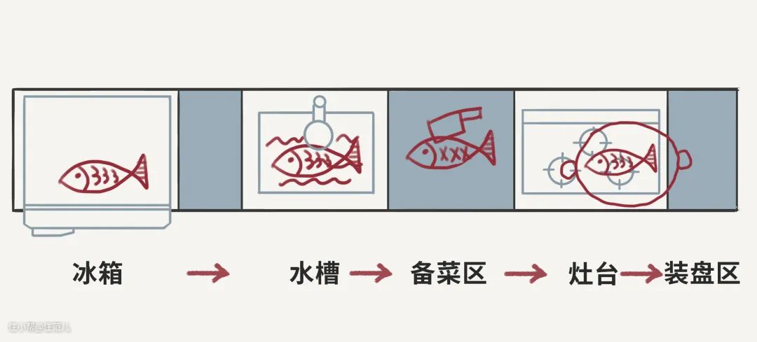 流畅的动线,应该是拿菜→洗菜→切菜→炒菜→摆菜,这样下来,合理的排列方式就是:冰箱、沥水区、水槽、备菜区、灶台、装盘区。