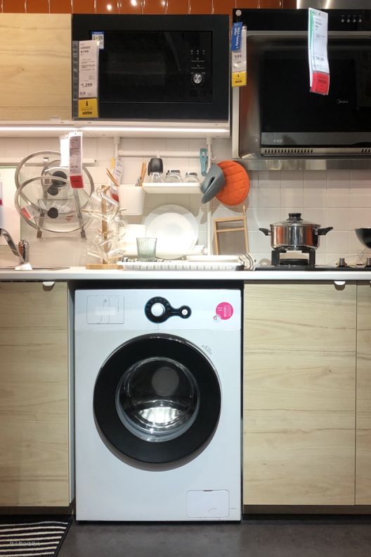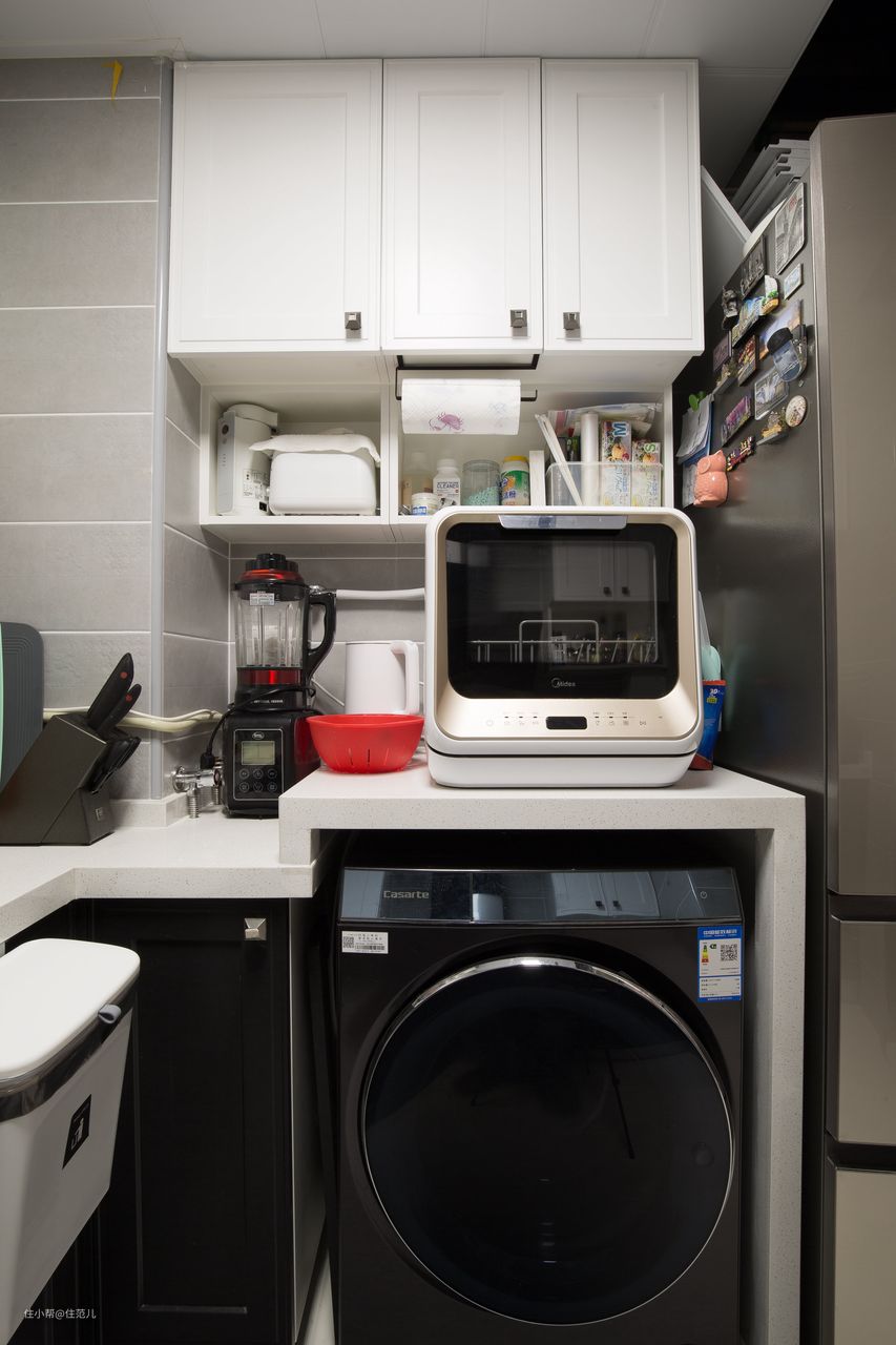 独立式的大容量洗碗机或洗衣机,也能放进台面下,整体高度不够的话,可以部分抬高。