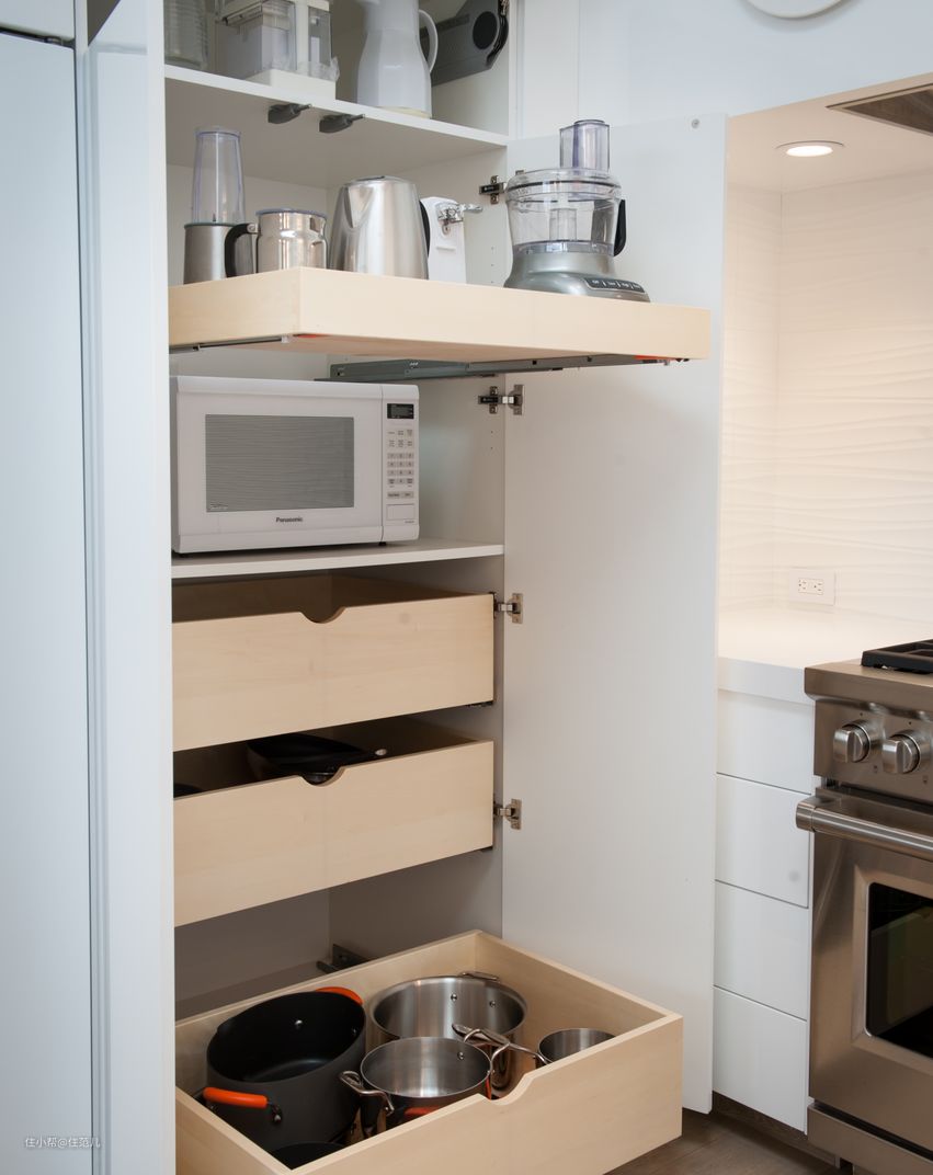 不嵌入电器的话,可以考虑做搁板、抽屉、抽拉板,取放小家电很方便,特别适合小户型。