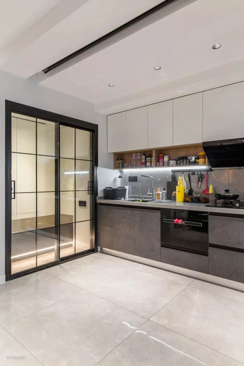 2.将石膏板或铝扣板吊顶,顺下来和橱柜顶部封住,更整体美观,但在普通家装的施工条件限制下,一般不会特别严丝合缝,还是会留下1~2cm缝隙。