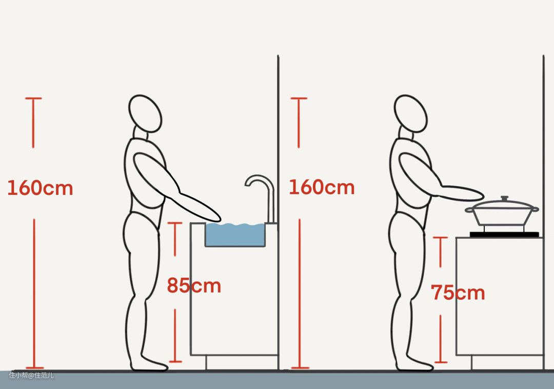 也就是说,一个150cm的人,橱柜高度至少是85cm;一个180cm的人,则需要95cm。