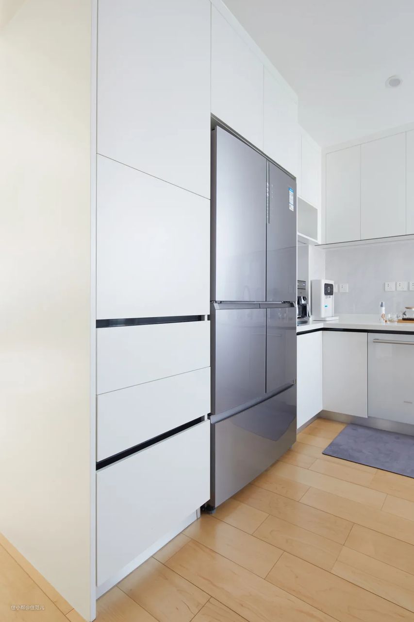 客户毛毛家,松下冰箱进深大,相对柜子很突出,所以设计师削薄了冰箱背后的非承重墙,放进后齐平工整,也不失为一个好方法。
