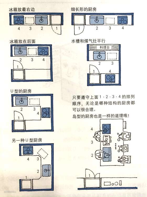 无论你家厨房是一字、L型还是U型,都能应用这个顺序。U型的转角处,其实就是备餐或盛盘区。