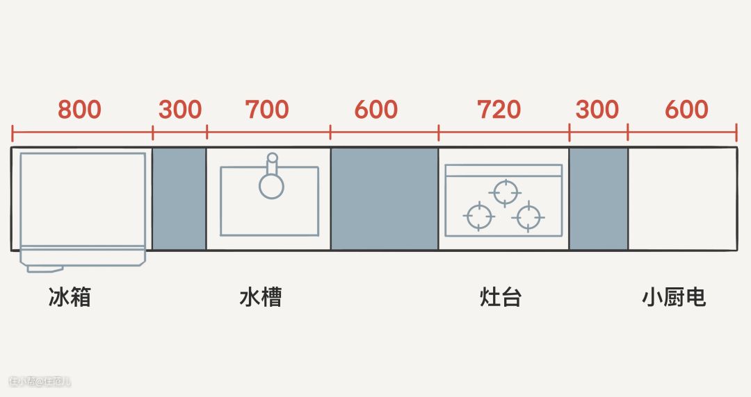 其次是灶台,建议跟侧墙留出20cm,不然使用靠墙炉头时,可能会比较碍手;如果该区域刚好作为盛盘区,可以留至30cm左右。