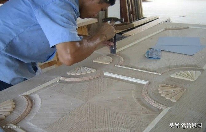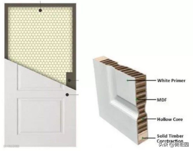 将木料钉成门骨架边框,内填蜂窝纸,然后在骨架的两面用胶合板、中纤维板贴三聚氰胺装饰纸、薄木皮等,表面采用油漆进行装饰。