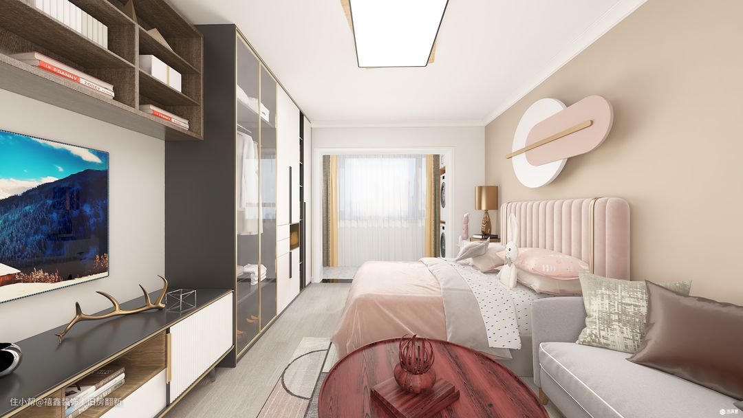 【卧室】卧室的整体偏向少女清新的风格,每一个女性都永怀一个青春少女的甜美梦想。粉色占据主体,而墙上色彩则采用橘粉色作为过渡,使得空间美而不腻。