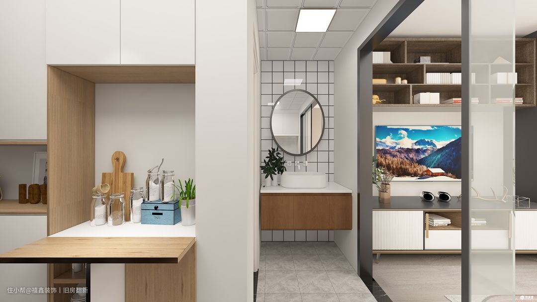 【卫生间】卫生间作为每个家庭不可或缺的一部分,不仅仅要满足功能还要足够的有品位。洗漱池外置不仅可以减轻卫生间的空间压力,更重要的是方便实用的同时还实现了干湿分离。壁挂式的洗漱池其实内部还是储藏柜,可以收纳物品。