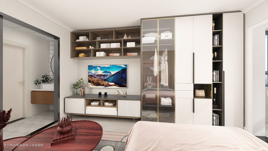 【卧室】 客厅与卧室在此次设计中合而为一,但是并不影响各自空间的使用效果和空间效果。卧室的衣柜做了整体私人订制,除了与客厅的电视柜紧密连接以外,更是在空间的格局上做了扩展。透明玻璃+开放格+书架展示架和壁橱成为了衣柜超级收纳的设计理念。