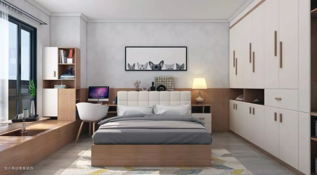 以前的卧室也没有什么设计而言,放下一张床、床头柜、安装衣柜,再搭配墙面颜色,配上合适的灯光就可以了,如: