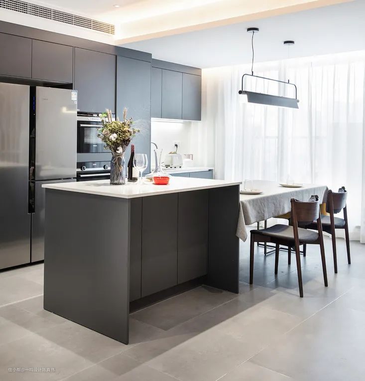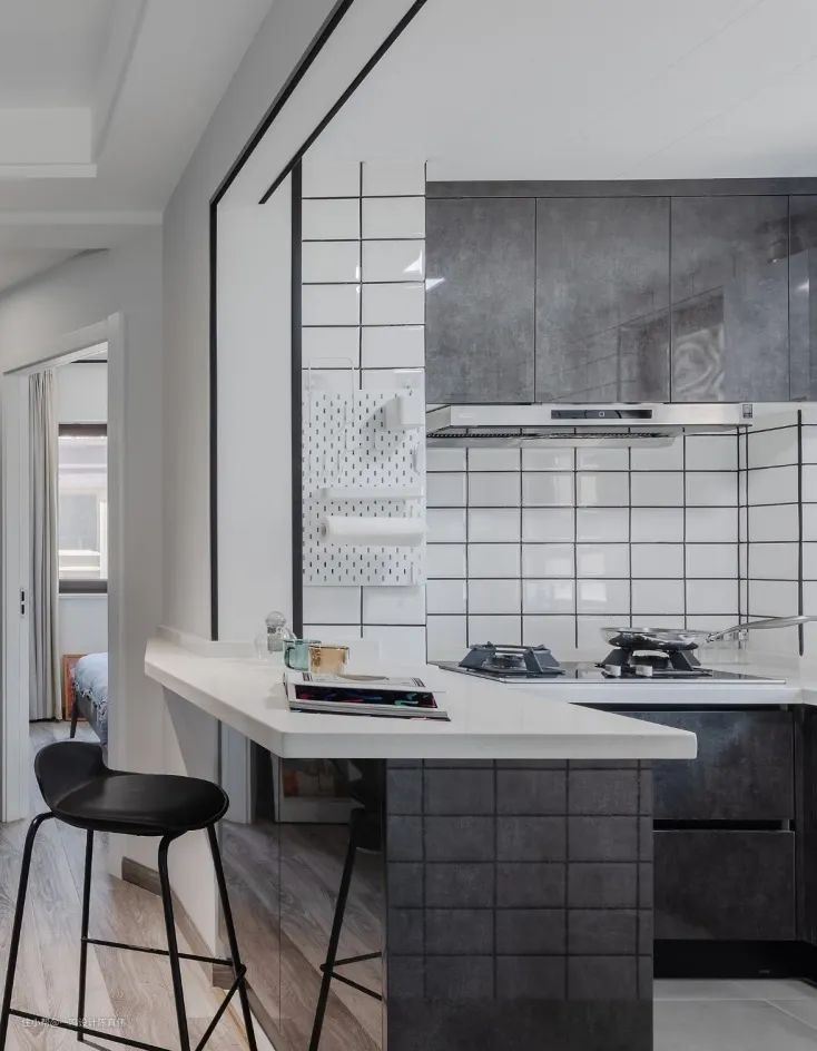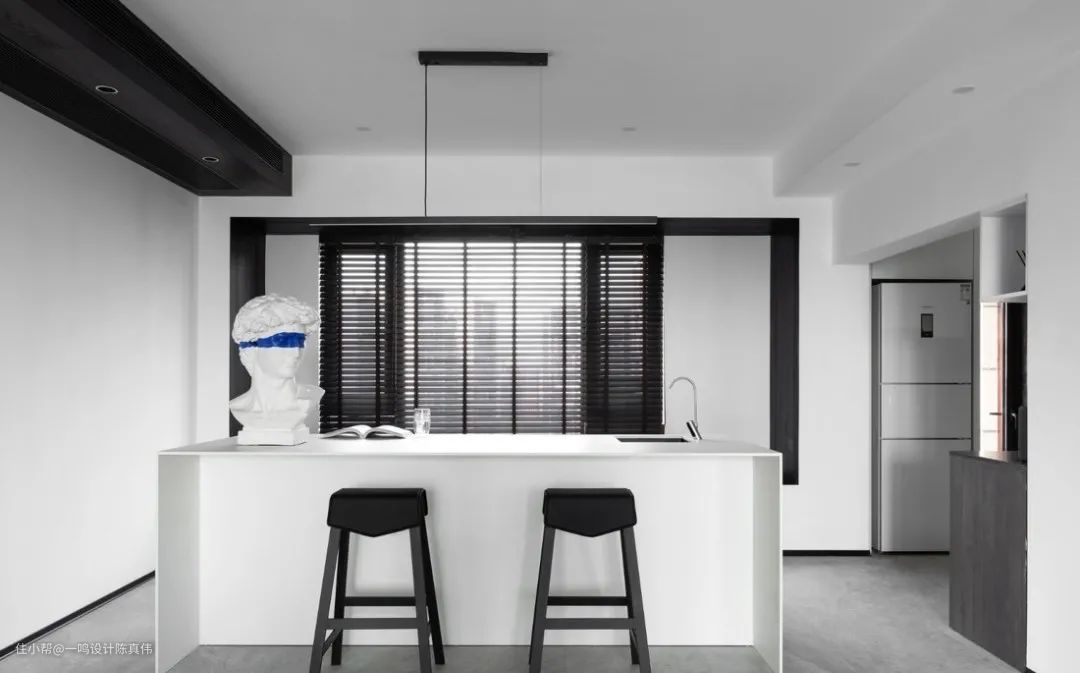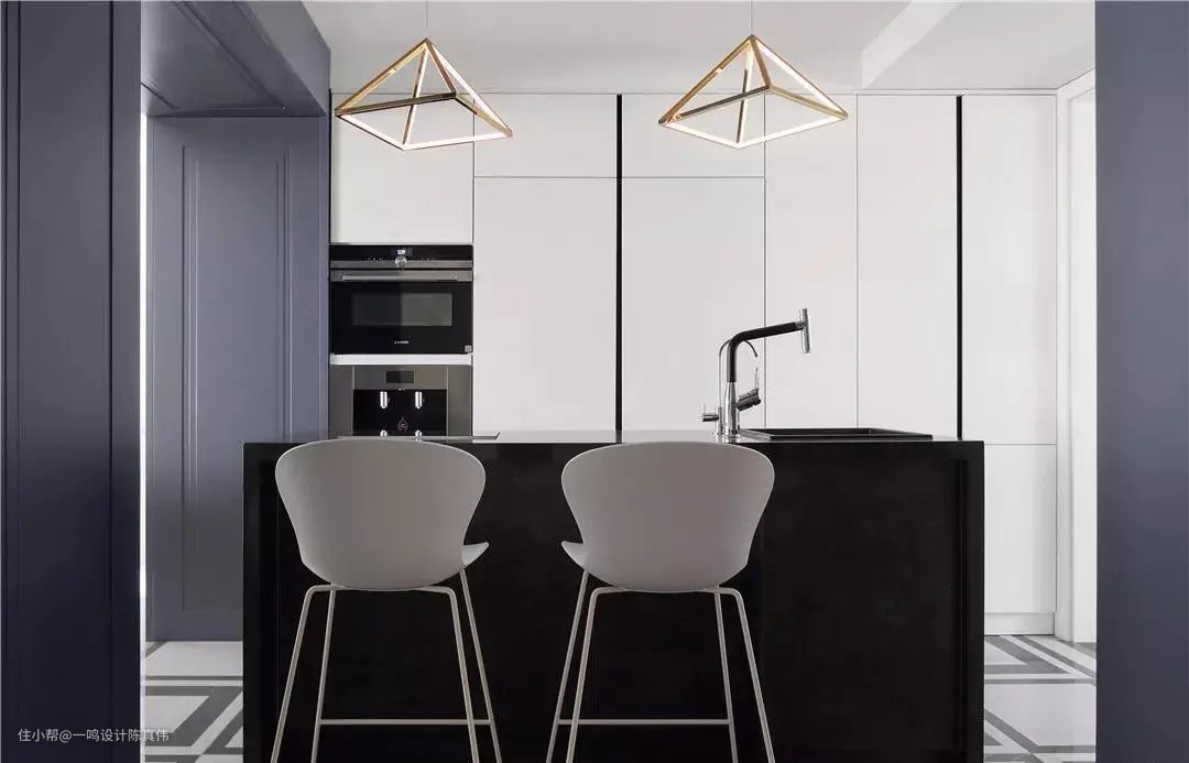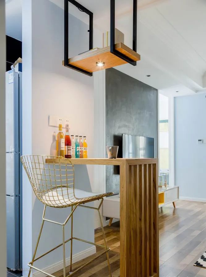 开放式是很多人喜欢的设计,能够扩大空间感,但是会存在空间的功能区分不明显的缺点,这时,拥有一个吧台就能完美解决问题,高颜值的吧台就是一个天然的隔断,划分功能区的同时,提升空间的设计感。