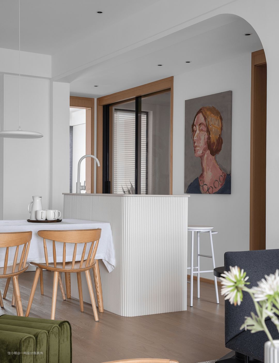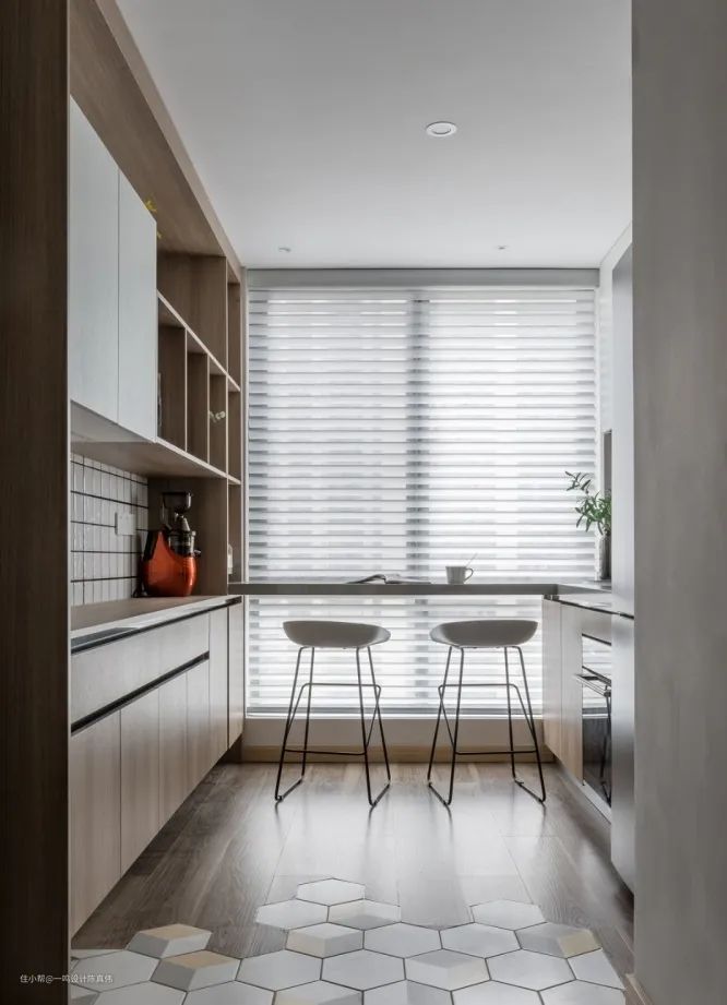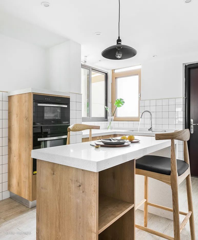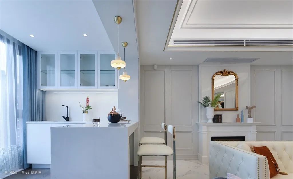 开放式是很多人喜欢的设计,能够扩大空间感,但是会存在空间的功能区分不明显的缺点,这时,拥有一个吧台就能完美解决问题,高颜值的吧台就是一个天然的隔断,划分功能区的同时,提升空间的设计感。