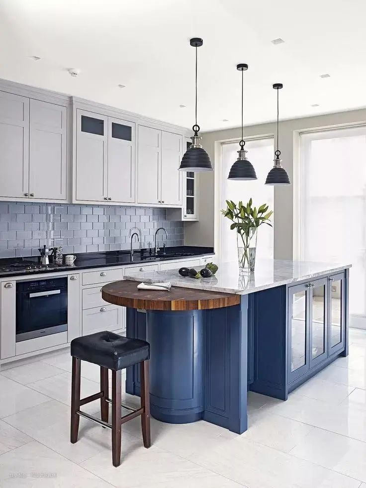 最常见于大面积的厨房,是厨房台面的延伸,中岛台的台面相对来说会比较高,用来切菜或做备菜区很合适。