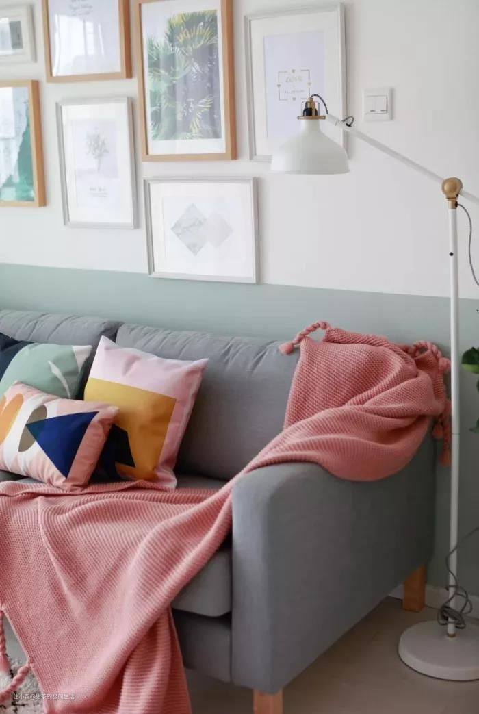 沙发是小伙从家具市场淘来的打折款,颜色和墙漆接近,质感也很柔软。为了提升客厅的氛围感,小伙在网上购买了落地灯和装饰画,把客厅好好地布置了一番,还真有点网红小屋的感觉。
