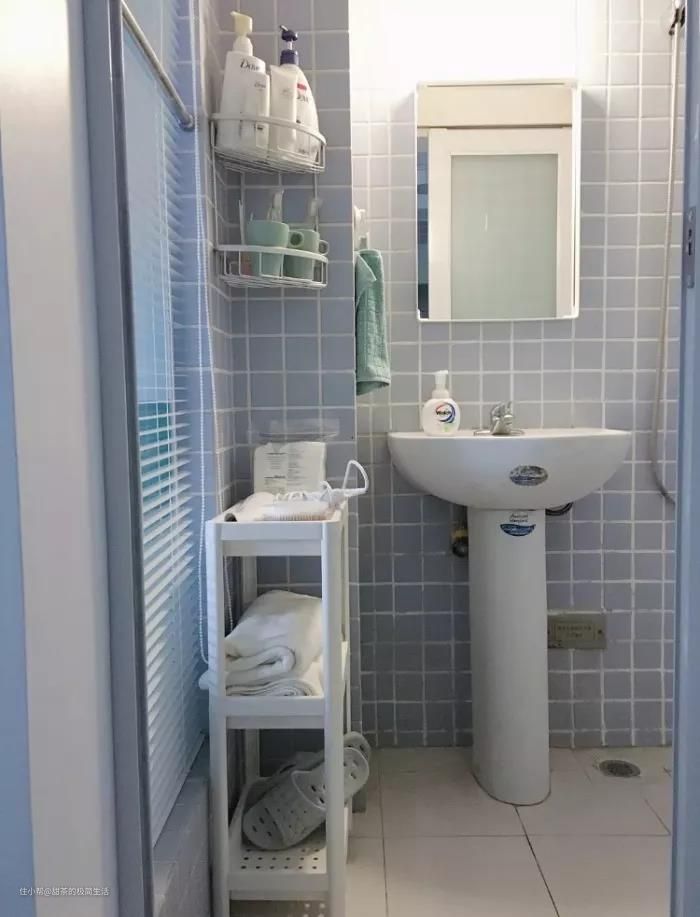 小伙清洗完墙砖后,重新做了一次美缝,并把浴室镜换成了简约的长方形,搭配塑料置物架,打造出一个干净清爽的卫生间。
