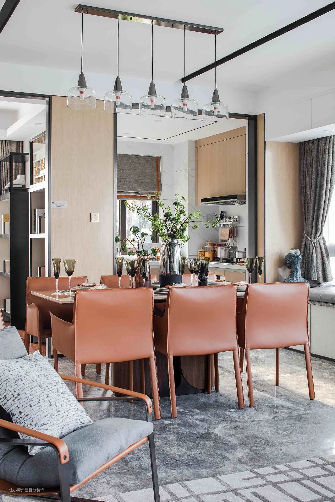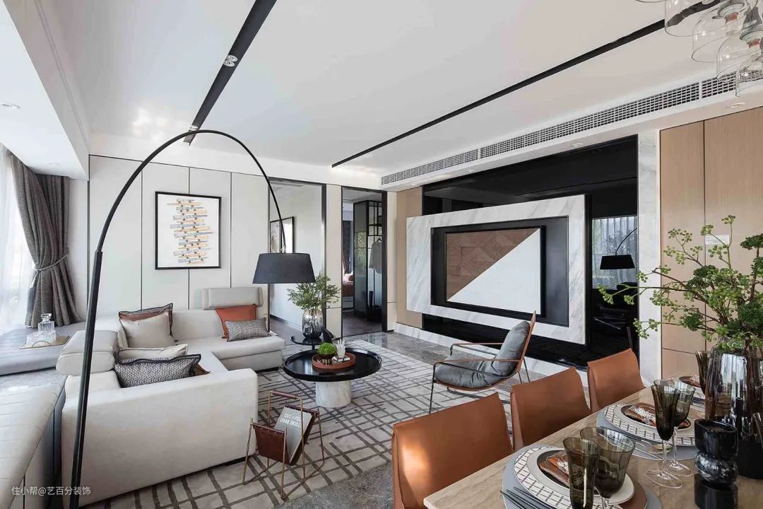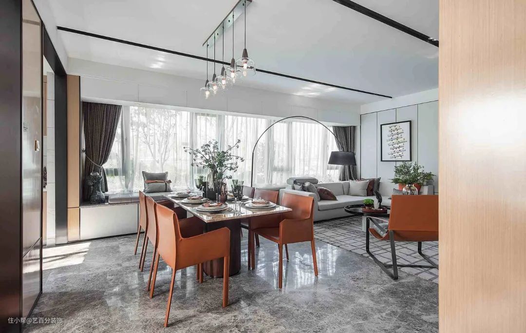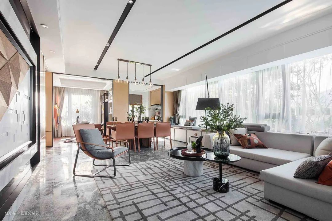 122㎡现代轻奢风格装修,大横厅+飘窗绝了艺百分装饰2021-07-25今天来感受一组122平现代轻奢风格的时尚魅力。非常开阔通透的大横厅+飘窗布局,厨房和书房都做了开放无遮挡处理,整个空间充满自由舒适感。客厅餐厅书房衣帽间卧室