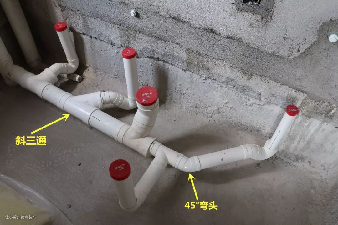 卫生间排水:尽量使用45度弯头和斜三通;