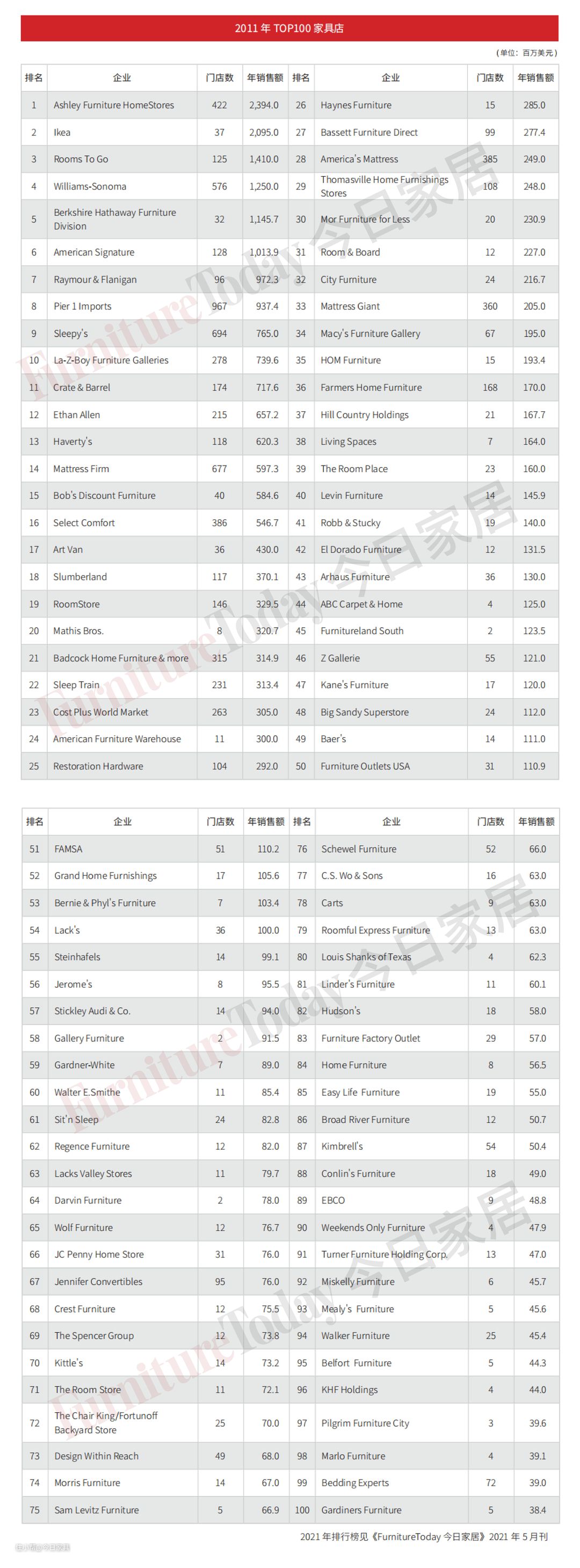 2021年排行榜,参见《总营收3123亿元!2021全美家具店TOP100排行榜大揭秘!》。