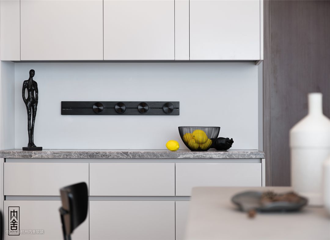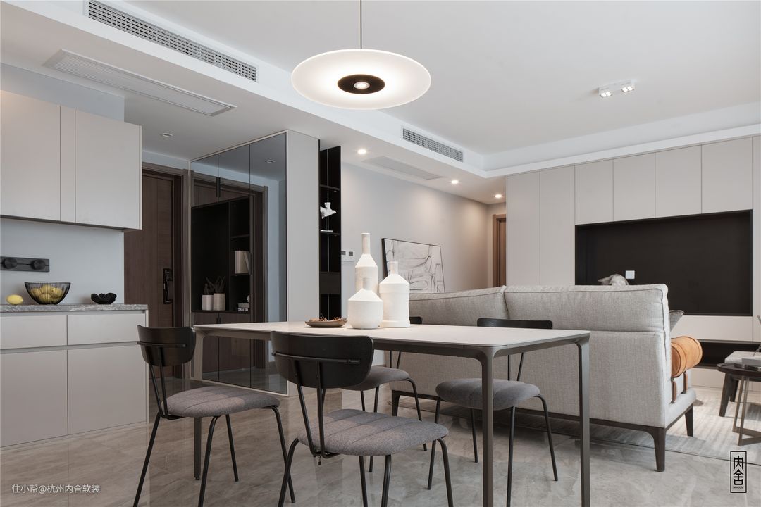 餐厅区域由于厨房空间有限,所以在餐厅过道的位置增加了定制的储物柜,配备了轨道插座,台面可放置小家电使用。
