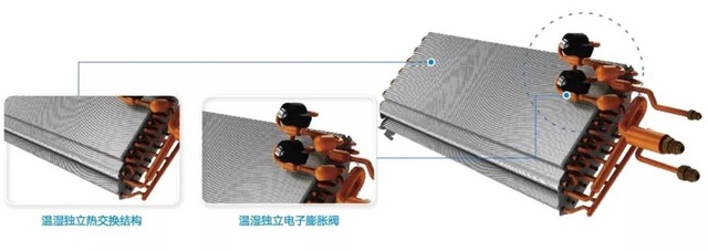 常见两管式风管机为单一换热器、单一电子膨胀阀,无法实现湿度与温度的单独控制。为了解决这一难题,大金的温湿平衡型室内机上配备双热交换器,双电子膨胀阀,并在液管、气管两管基础上,增加第三根管——高低压管。高低压管可回收室外机废热,将热量传送回室内机第二块热交换器处,用于加热除湿后的低温空气,减轻了冷风对人体的刺激,大大提升了使用除湿功能时的舒适度。