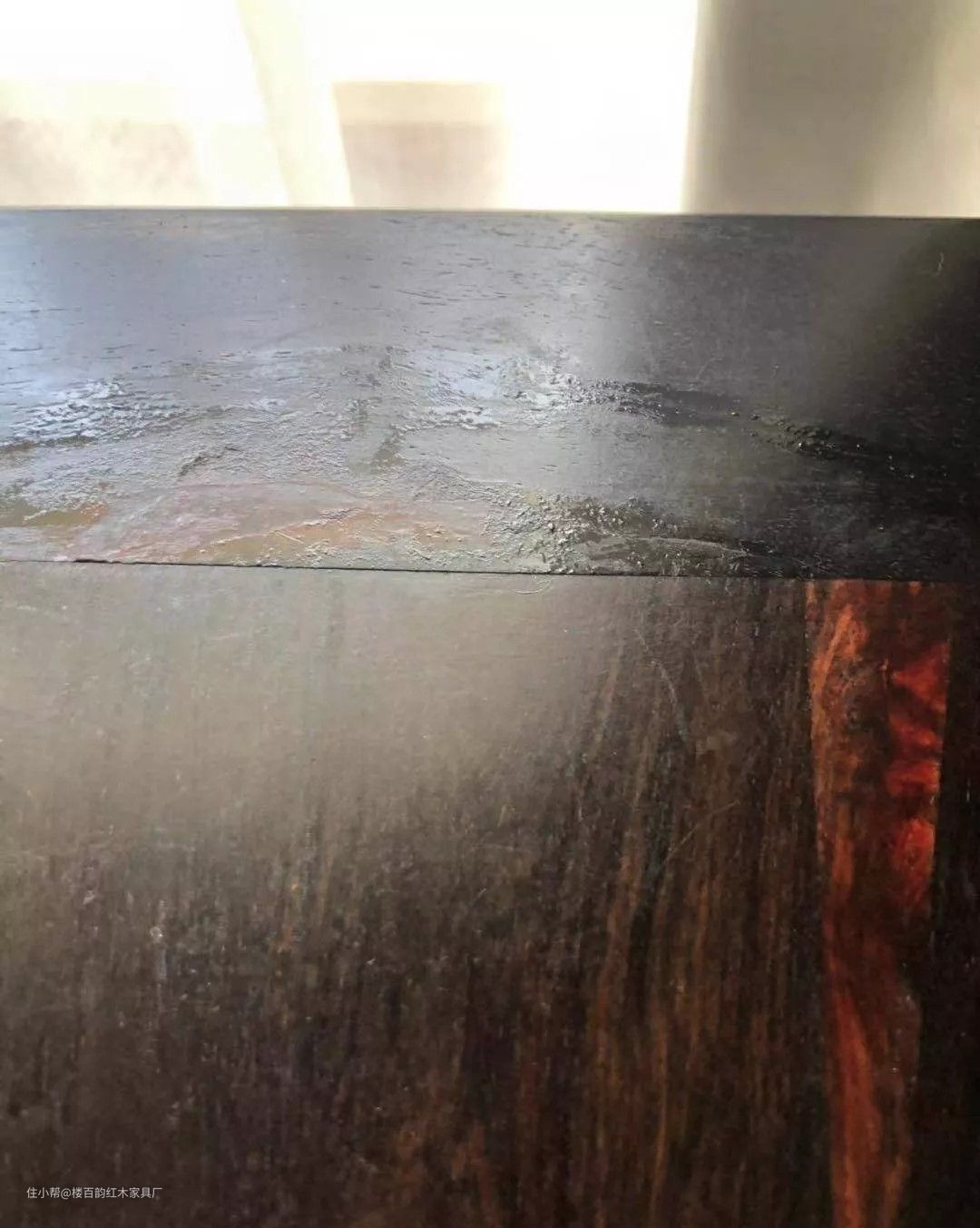 好好的一套红木家具在橄榄油的浸泡下不但没有使家具变得更加润滑油亮。反而把贵重的红木家具给毁容了。现场看不到一丝的光亮,而是沾满油污的灰尘和被油渍与红木自身油性互相抵抗的反应渗出的污渍。所有的灰尘掉进油里会填满红木家具的毛孔,不仅会滋生细菌对红木家具的损害是非常大的。所以如上图现实证明红木家具绝对不能用核桃油和橄榄油来做保养的。