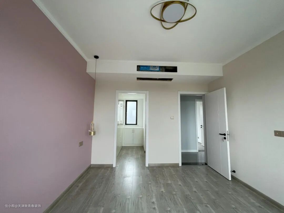 主卧空间略大,将卫生间改成衣帽间也比较大胆。估计只有我们年轻人才敢这么做,哈除了中央空调,只装了石膏线条。床头背景墙涂了珊瑚色,很漂亮的粉色,视觉上和其他墙不一样。经过三个月的努力,完成效果值得一看。