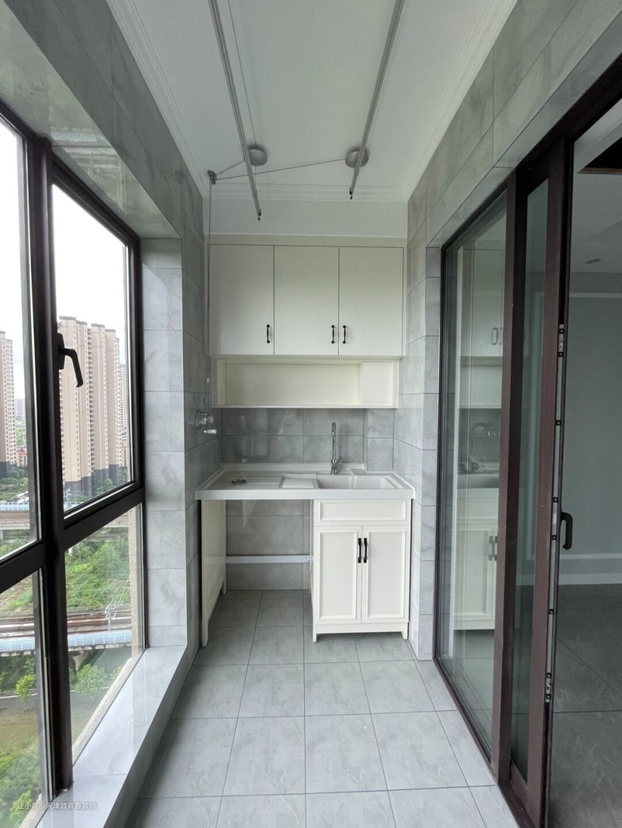 客厅与生活阳台没有选择打通,但是不影响整体的效果。利用阳台的位置,定制了非常实用的洗衣柜,旁边预留了刚好可以放洗衣机的位置,大小位置合适。以后搬新家入住了,在这里不管是手洗还是机洗,都方便很多,不会有什么影响。顶面安装了晾衣架,方便晾晒衣物。窗户用玻璃封住,可以遮风挡住,特别赞。