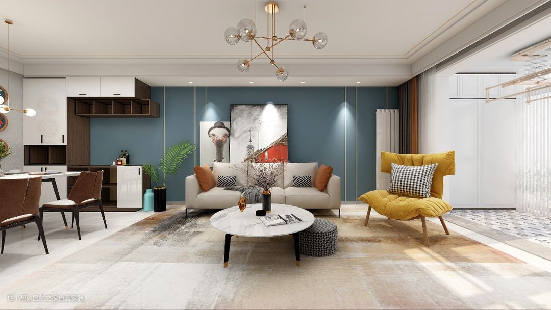 此户型为两居室格局,套内面积为75平米。客厅餐厅为整体贯通,呈一个南北通透的状态,明厨暗卫,生活空间整体日照十分充足,采光与通风上都是极佳,居住舒适度非常高。整个房屋都以北欧轻奢风格基调,在现代舒适的空间下以低饱和度的色彩布置。设计的重点在于打造舒适宜人的内部居家,优化各功能区之间合理的交通流线。