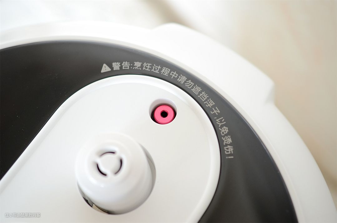 凑近看,有警告提示:烹饪过程中请勿遮挡红色浮子,以免烫伤。