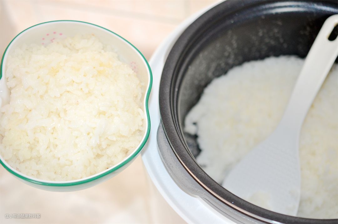 米饭蒸好之后,米粉韧劲和嚼劲都很不错,不沾内胆的作用比较大,在盛饭过程中,内胆壁并没有任何黏连的地方,在清理过程中非常方便。