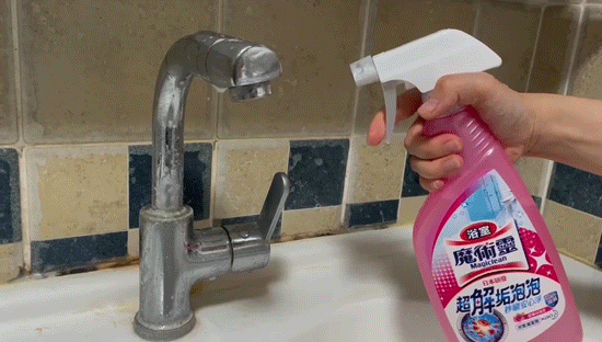水龙头、花洒的表面污渍比较好去除,只需用花王的浴室清洁魔术灵轻轻给两喷,表面的去渍效果就很明显。