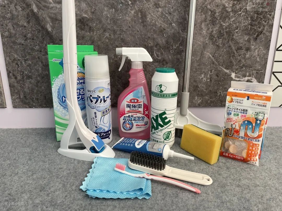 我们选了目前市面上较火的产品,如:花王浴室魔术灵、威猛先生洁厕液、斧头牌去污粉、除霉啫喱、下水道泡腾片、一次性马桶刷。