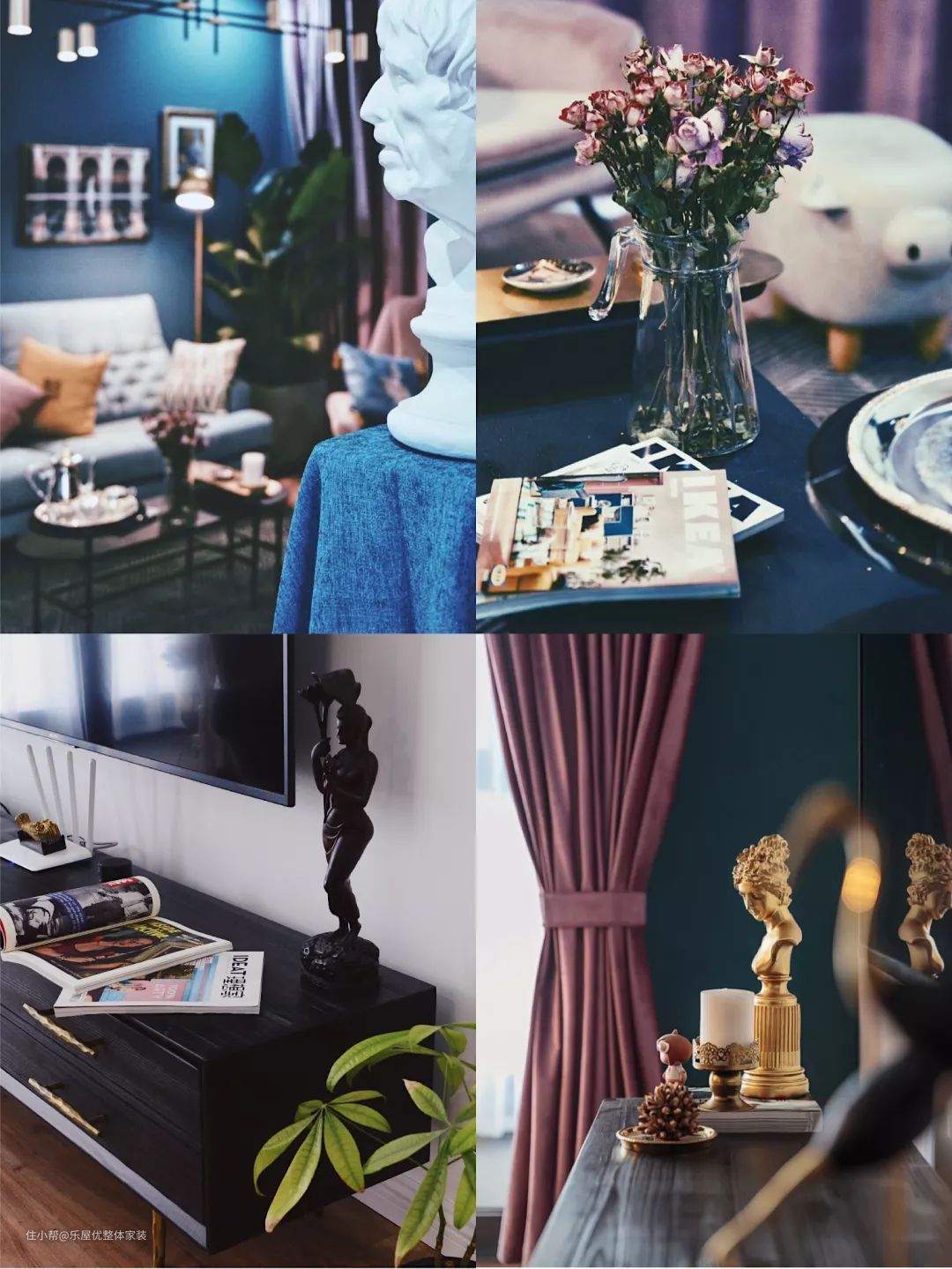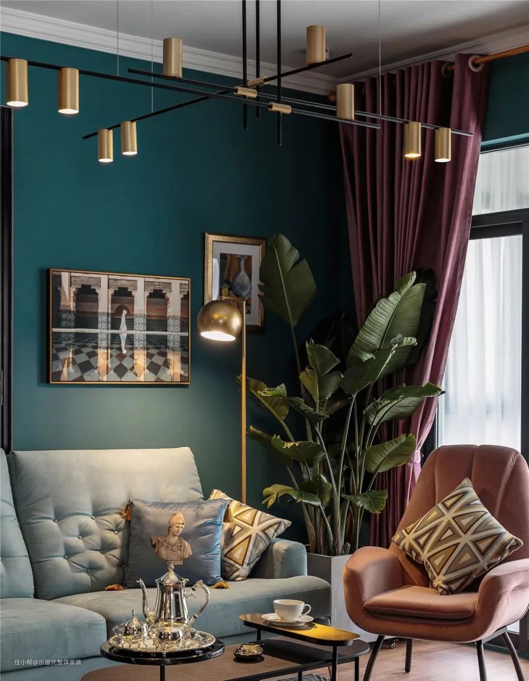 在整体风格上,也并没有完全固定统一,丝绒质地的沙发,北欧风绿植,金属复古的落地灯,精美的挂画构成了一个复古加轻奢的混搭客厅。