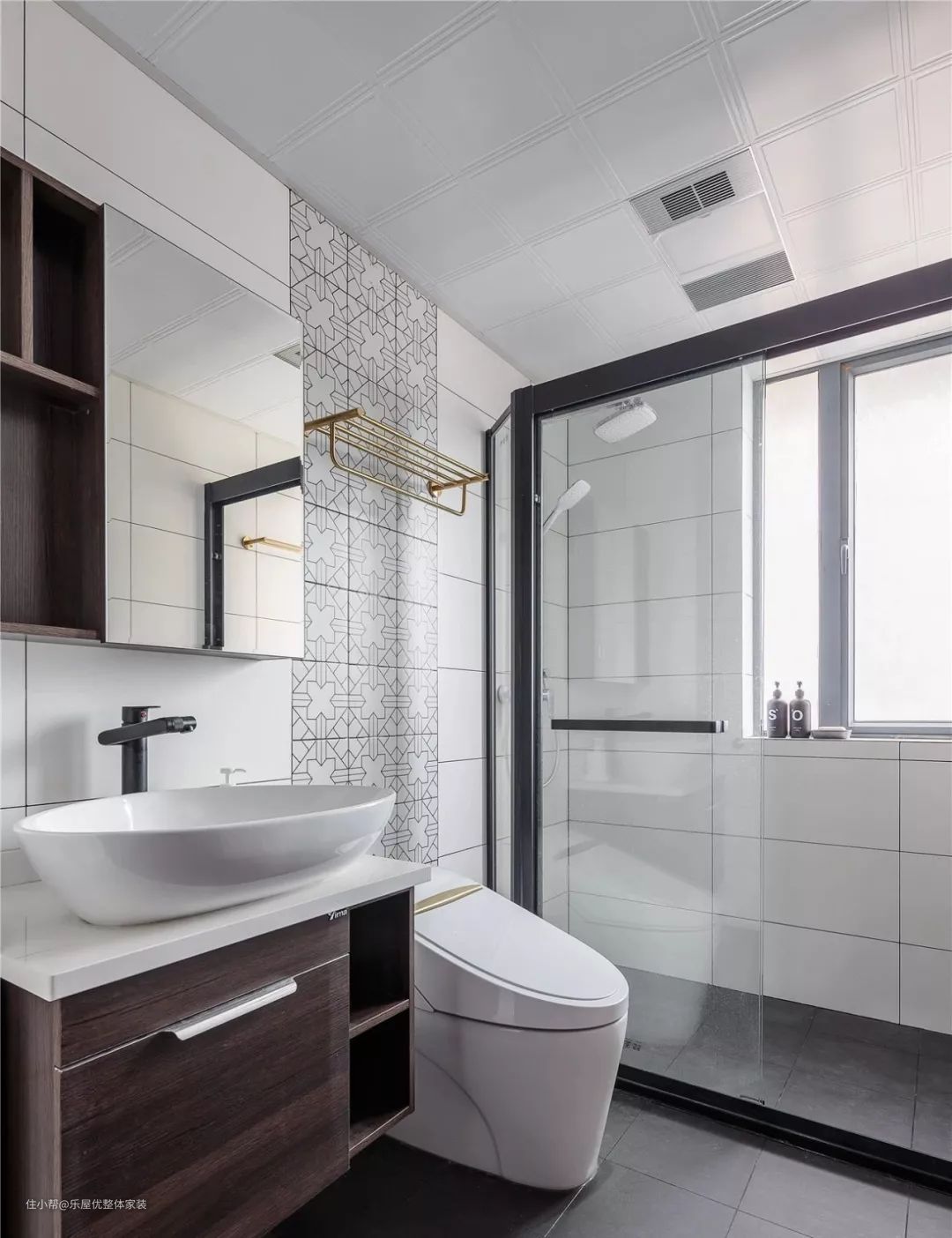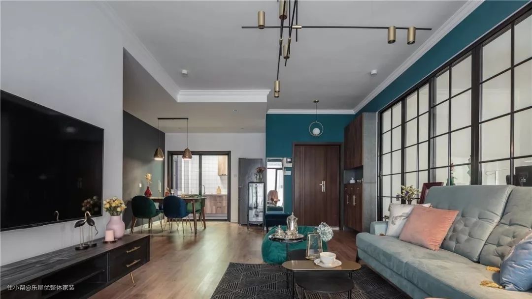 业主本身是平面设计师,审美眼光独到又比较喜欢时尚的元素,所以当下流行的“黑框玻璃门”“金属灯具”“原木风厨房”都融合到了设计中。